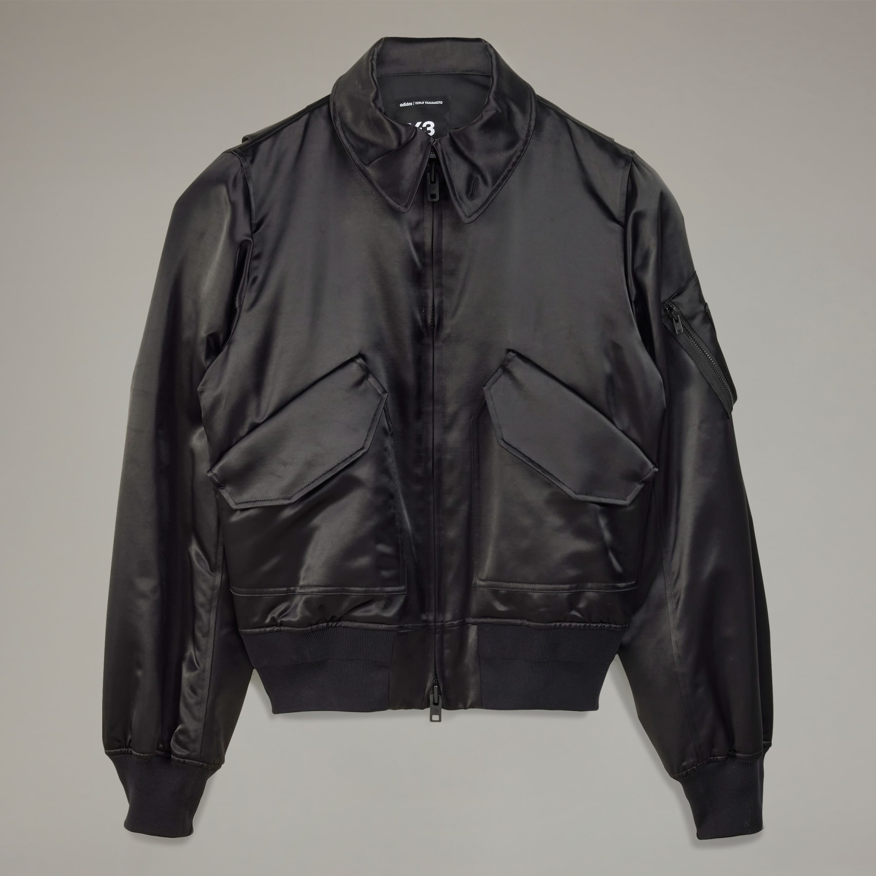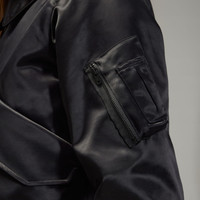 A satin bomber jacket from Y-3. The Y-3 Bomber Jacket is a premium take on an iconic style through the fashion-forward lens of Y-3. This flight-style jacket features a wide collar with a two-way center front zip and a nylon and cotton satin build that's durable and soft for elevated comfort. Utilitarian details include a patch pocket on one sleeve and two additional flap pockets on the front. A satin heat transfer Y-3 logo on the back neck provides a minimalist finish. Details - Regular fit - Two-way full zip with bomber collar - 54% polyamide, 46% cotton - Brushed back - Front flap patch pockets - Sleeve patch pocket - Ribbed cuffs and hem - Satin Y-3 logo - Imported - Product code: JD1757 - Product color: Black