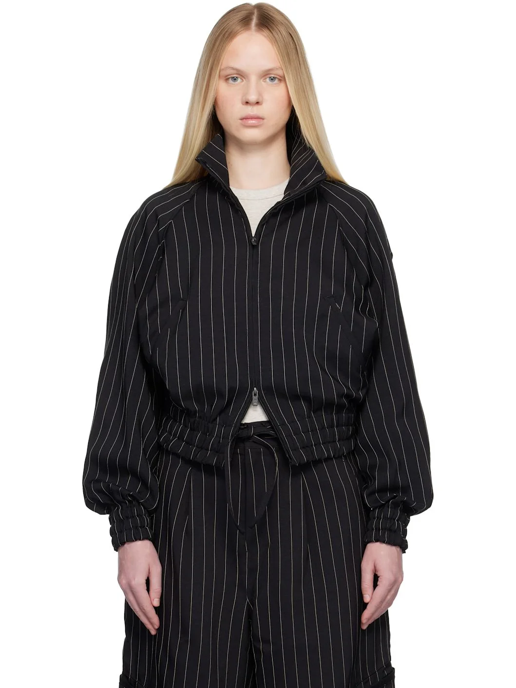 Recycled polyester twill-blend jacket. · Pinstripes throughout · Funnel neck · Two-way zip closure · Zip pockets at waist · Elasticized hem and cuffs · Raglan sleeves · Logo printed at back yoke · Unlined Supplier color: Black 99% recycled polyester, 1% viscose. Made in Viet Nam 261138F063007
