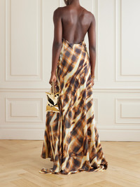 Y/PROJECT's dress is cut on the bias from satin and printed with abstract checks which look like they've been bleached by sunlight. It has a cowl neckline framed by the label's 'invisible' spaghetti straps, so it appears as if it's floating over your frame, along with a dramatic train.