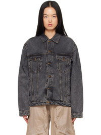 Non-stretch organic cotton denim jacket. · Spread collar · Pliable wire at button closure · Flap and welt pockets · Vented side seams · Single-button barrel cuffs · Leather logo patch at back collar · Adjustable button tabs at back hem · Logo-engraved gold-tone hardware · Contrast stitching in tan Part of the Evergreen collection. Supplier color: Vintage black