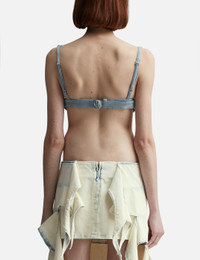 - Y/PROJECT - Scrunched Denim Bralette - Metal foil fused to the lining to the cup lining - Customisable by scrunching and twisting - Adjustable spaghetti straps at back - Adjustable cinch closure at back - Wire at hem - Color: Ice Blue - Country Of Origin: FR - Material: 91% Cotton, 7% Elastomultiester, 2% Elastane - See more Tops and Clothing SIZING - Model wears size 36 - Model measures: Height 177cm, Chest 32”/81cm, Waist 23.5”/59.7cm, Hip 33’’/83.8cm