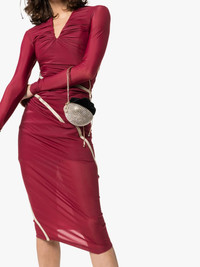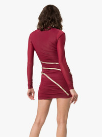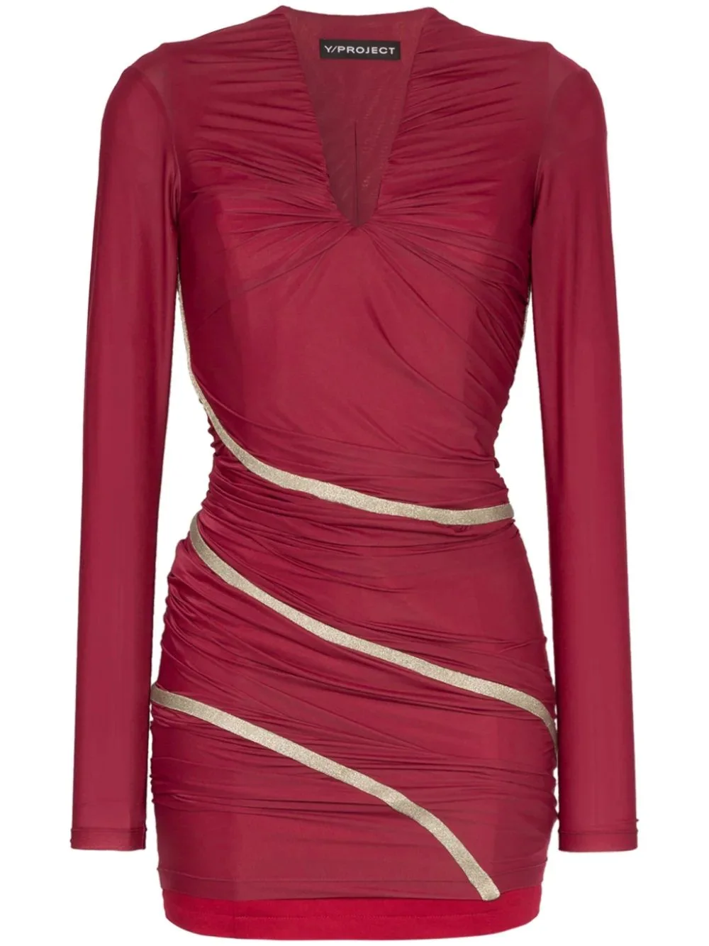 Fitted Draped Maxi Dress Y/PROJECT possesses a near-unique ability to create streetwear styles that reference gothic grandeur and refined elegance, in assortments that transcends age and gender. This burgundy red cotton blend draped maxi dress from Y/PROJECT features a v-neck, ruched details, long sleeves, a stretch fit, an ankle length and curved white stripes. Imported Composition Cotton 100%, Polyamide 90%, Spandex/Elastane 10% SIZE & FIT Model measurements Height 5 ft 10 in(1.78 m) Bust/Chest 33.85 in(86 cm) Hips 34.25 in(87 cm) Waist 24.01 in(61 cm) Washing instructions Dry Clean Only