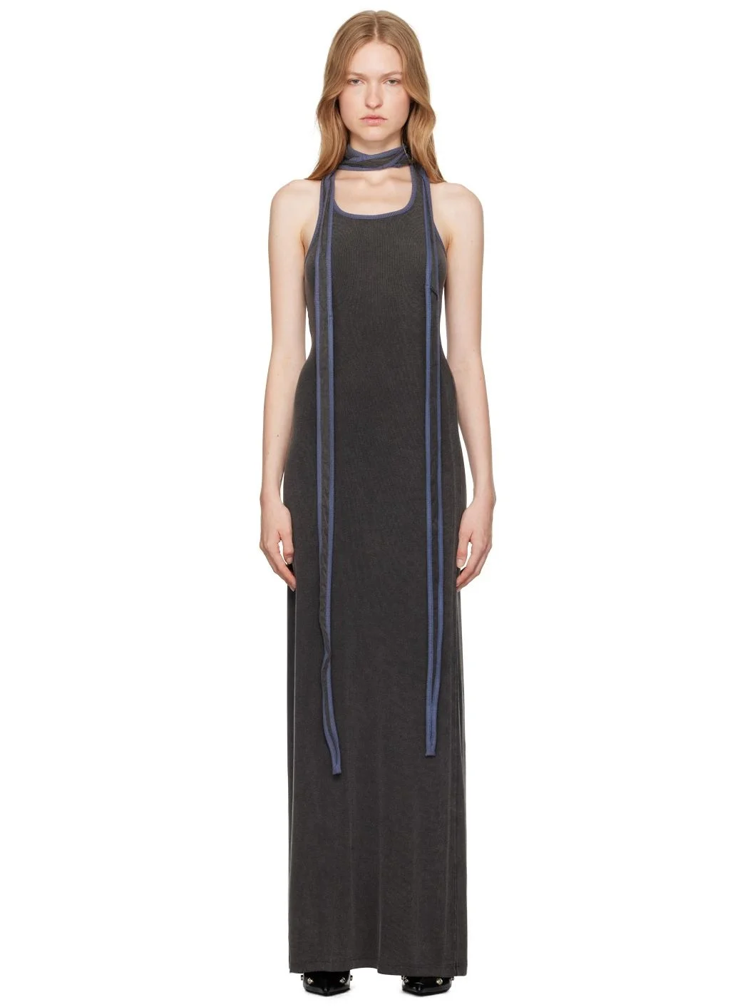 Ribbed stretch viscose jersey maxi dress. · Scoop neck · Integrated scarf-style straps at shoulders · Racer back Supplier color: Dark grey 96% viscose, 4% elastane. Made in Bulgaria 242893F055003