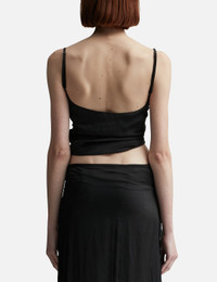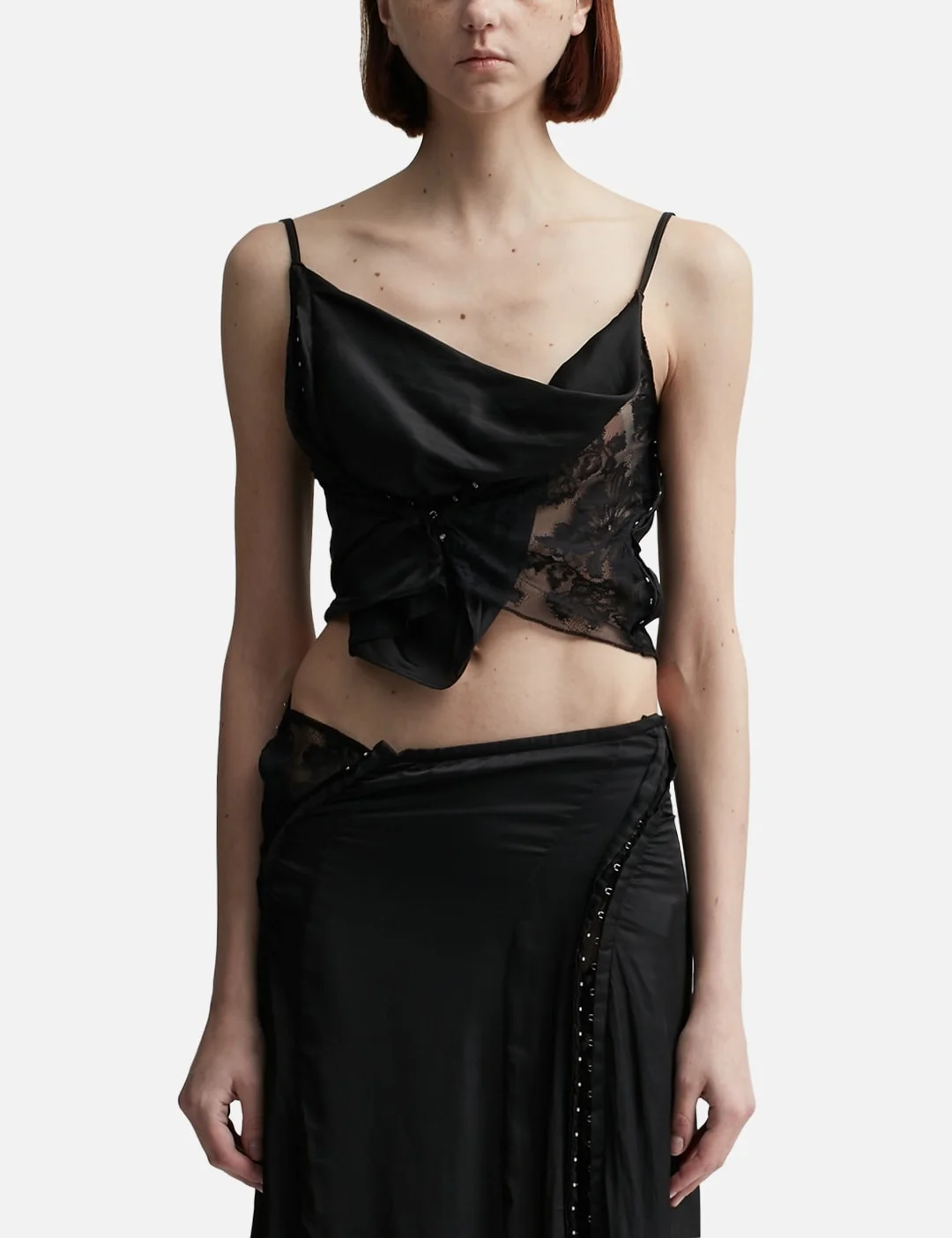- Y/PROJECT - Hook and Eye Cami - Slip camisole with extended lace panels - Hook and eye closures lining the side seams - Recycled polyester-blend camisole - Styling various ways by changing how the seams hook together - Color: Black - Country Of Origin: FR - Material: 100% Polyester ;56% Recycled - See more Tops and Clothing SIZING - Model wears size 36 - Model measures: Height 177cm, Chest 32”/81cm, Waist 23.5”/59.7cm, Hip 33’’/83.8cm