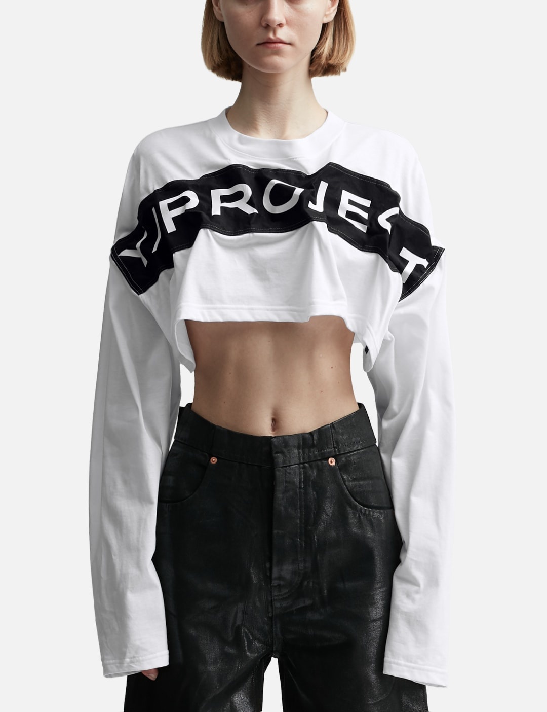 - Y/PROJECT - Scrunch Logo Long Sleeve Top - Crewneck - Logo detail at front - Cropped length - Color: Optic White - Country Of Origin: FR - Material: 100% Cotton - See more Tops and Clothing SIZING - Model wears size S - Model measures: Height 179cm, Chest 32”/81cm, Waist 23’’/58.42cm, Hip 35’’/88.9cm