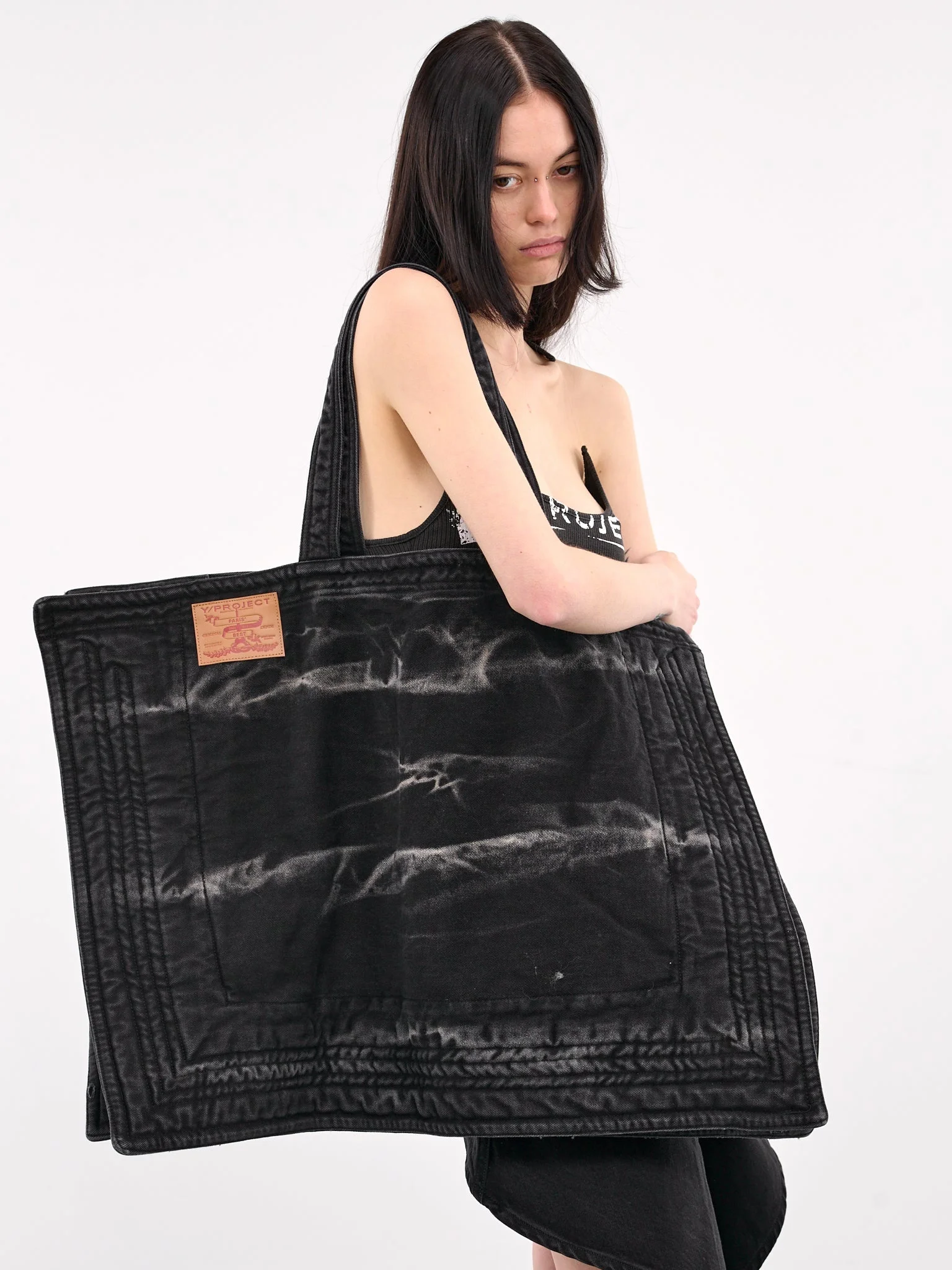 Y/PROJECT bag in black, cabas style design, paneled denim construction, fading & whiskering, twin fixed shoulder straps, logo patch, tonal topstitching, wire structuring. Made in Portugal Main: 100% Cotton Wire: 100% Metal One Size