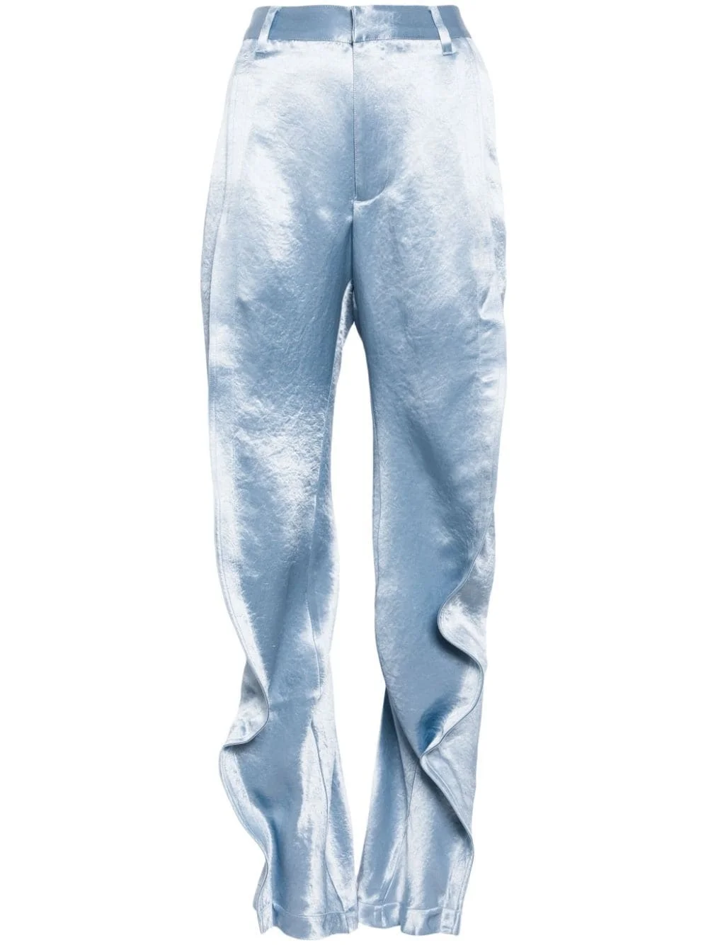 ruffled satin trousers Highlights - Light blue - Satin finish - Ruffled detailing - High-waisted - Belt loops - Two side slit pockets - Tapered leg Imported Composition Outer: Acetate 100% Lining: Viscose 100% SIZE & FIT Model measurements Height 5 ft 9 in(1.76 m) Bust/Chest 31.1 in(79 cm) Hips 35.03 in(89 cm) Waist 24.4 in(62 cm) FittingInformation Designed for a tapered fit, these trousers allow for a close fit at the waist and a loose unrestricted fit over the leg with a closer fit towards the ankle Made from a midweight non-stretch fabric This piece fits true to size – take your usual size