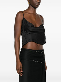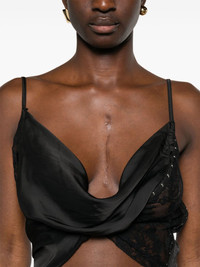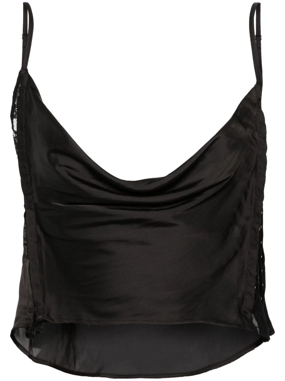 sheer-lace draped top Highlights - Black - Recycled polyester - Chiffon - Draped design - Semi-sheer construction - Sheer lace panelling - Cowl neck - Adjustable spaghetti straps - Low back - Side hook and eye fastening - Cropped - High-low hem - Partial lining Imported Composition Recycled Polyester 59%, Polyester 41% SIZE & FIT Model measurements Height 5 ft 10 in(1.77 m) Bust/Chest 32.28 in(82 cm) Hips 35.03 in(89 cm) Waist 25.19 in(64 cm) FittingInformation Designed for a slim fit that sits just away from the body offering a close yet comfortable fit The adjustable shoulder straps allow for a preferred fit when worn Made from a lightweight non-stretch fabric This piece fits true to size – take your usual size