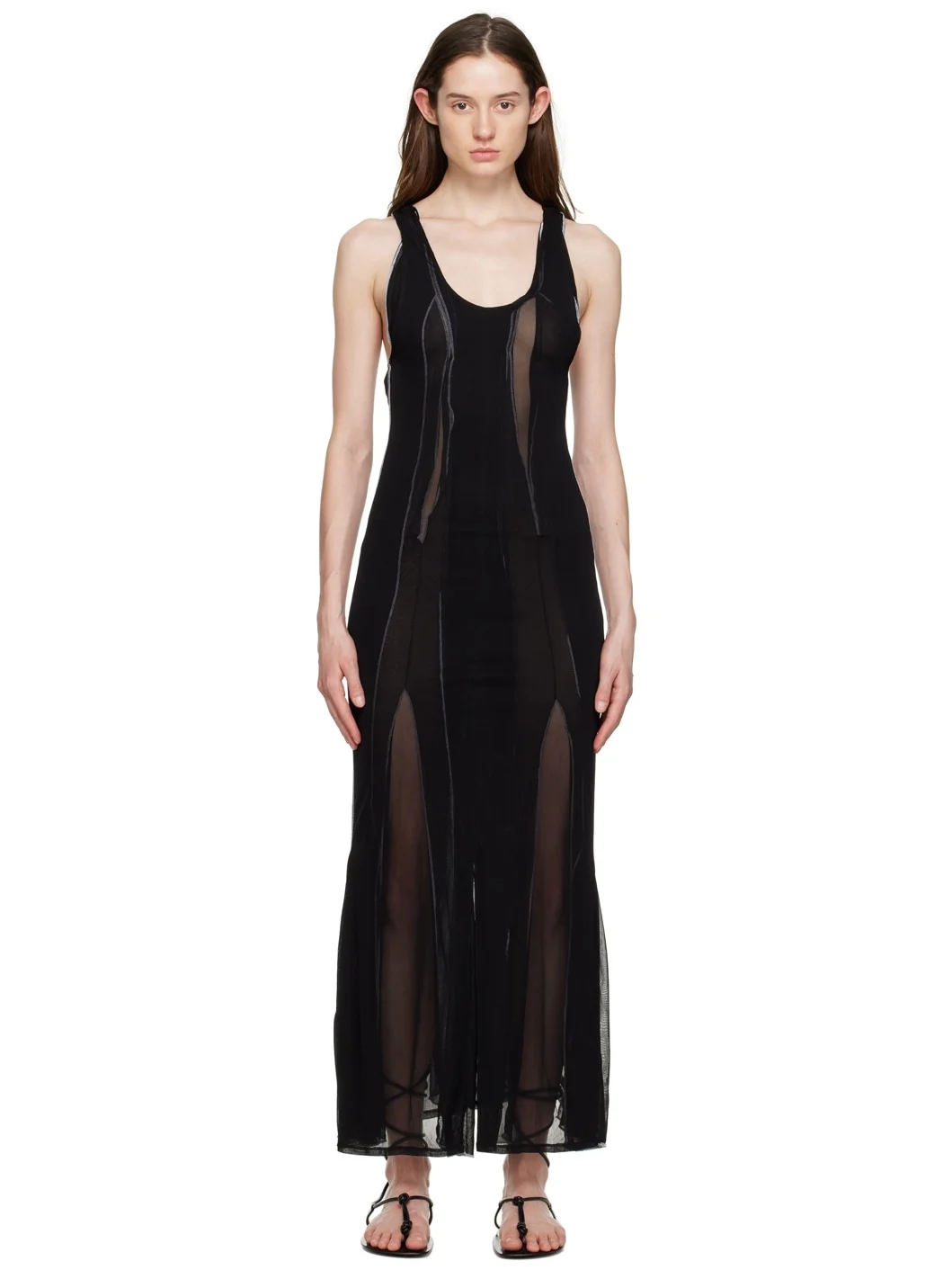 Semi-sheer viscose mesh dress. · Paneled construction · Scoop neck · Vent at front hem · Racer back · Ruffles at interior · Fully lined · Contrast stitching in white Supplier color: Black 100% viscose. Made in Poland 231893F055014