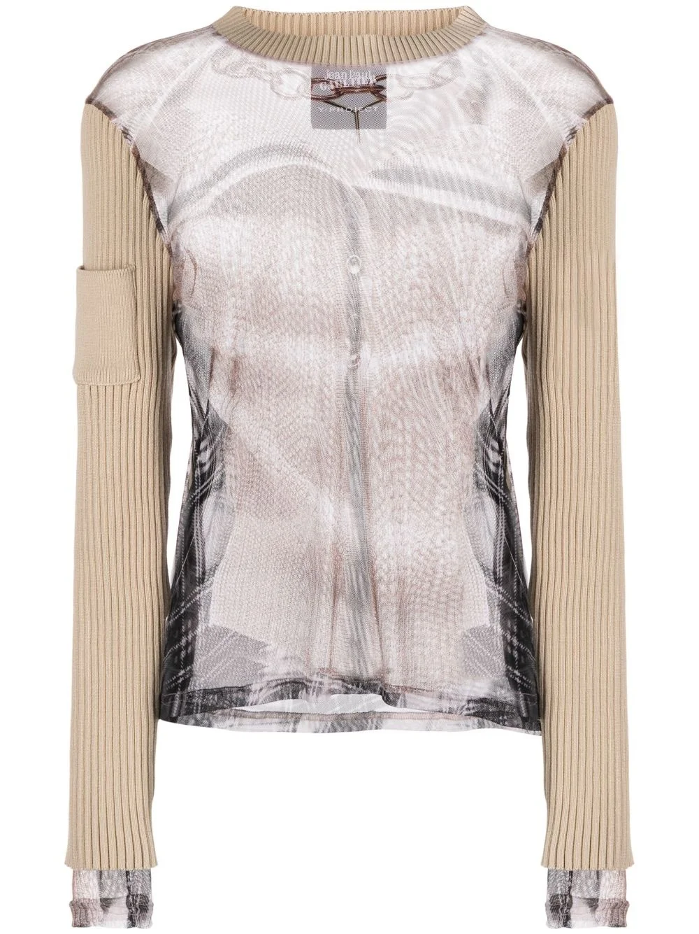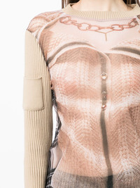 x Jean Paul Gaultier Trompe L'Oeil top Designed in collaboration with Jean Paul Gaultier, Y/Project creates an avant-garde top with an illusory print of the brand's Ruffle Necklace cardigan. Ribbed panelling finishes the design. Highlights - Light beige - Semi-sheer construction - Crew neck - Long sleeves Imported Composition Body: Polyamide 100% SIZE & FIT Model measurements Height 5 ft 10 in(1.78 m) Bust/Chest 30.31 in(77 cm) Hips 34.64 in(88 cm) Waist 24.01 in(61 cm) FittingInformation Designed for a slim fit that sits just away from the body offering a close yet comfortable fit Made with a midweight knit, this piece offers some stretch This piece fits true to size – take your usual size