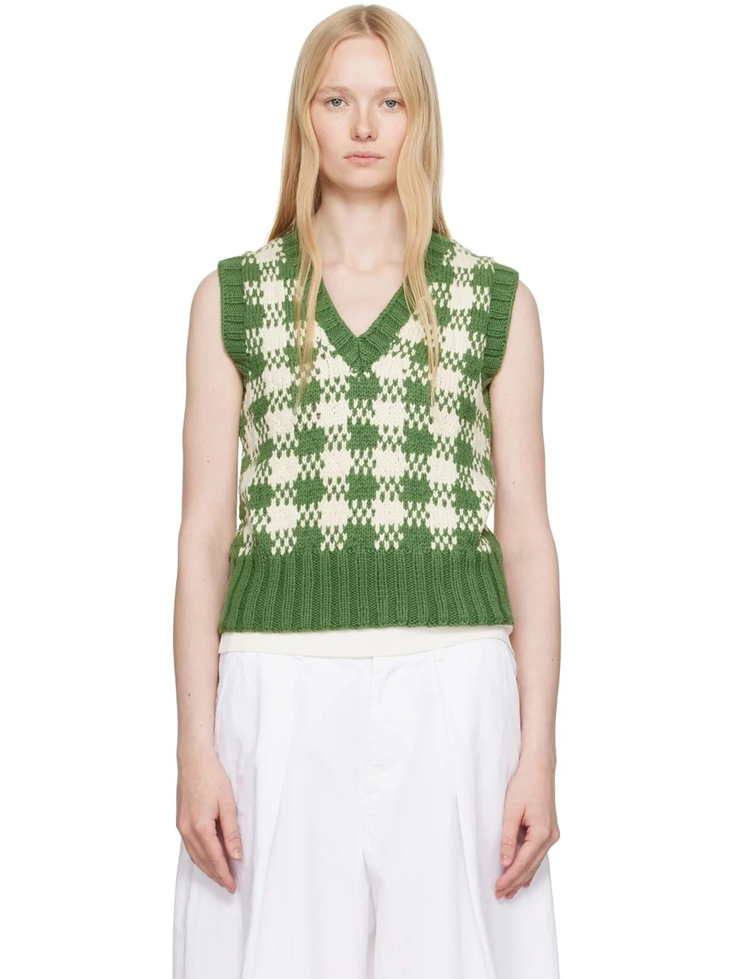 Hand-knit cotton vest. · Jacquard check pattern throughout · Rib-knit V-neck, hem, and armscyes Supplier color: Green 100% cotton. Made in India 251161F068002