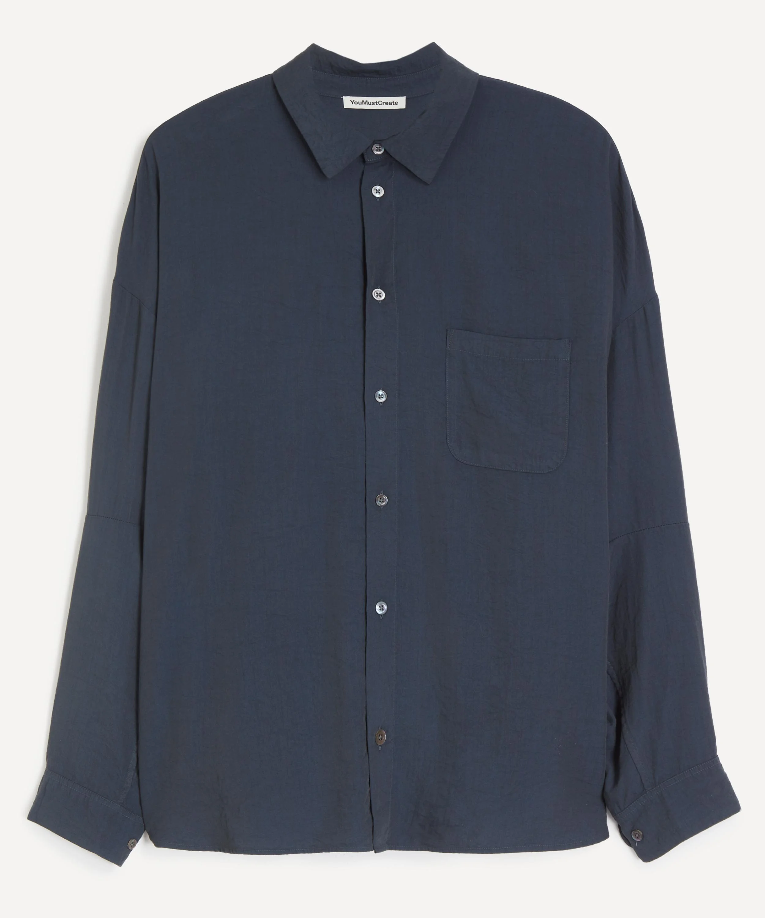 DETAILS Navy viscose shirt Oversized fit Long-sleeves Single-button cuffs Point collar Mother-of-pearl button fastening Chest pocket SIZE & FIT Model is 175cm/5’9" Chest: 82cm; Waist: 59.5cm; Hip: 86cm and wears a size S COMPOSITION & CARE 76% Viscose; 24% Polyamide Machine washable