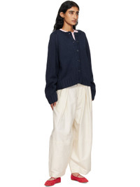 Knit cotton cardigan. · Rib-knit crewneck, hem, and cuffs · Button closure · Purl-knit placket · Raglan sleeves · Corozo hardware Available exclusively at SSENSE. Supplier color: Navy 100% cotton. Made in India 252161F095003