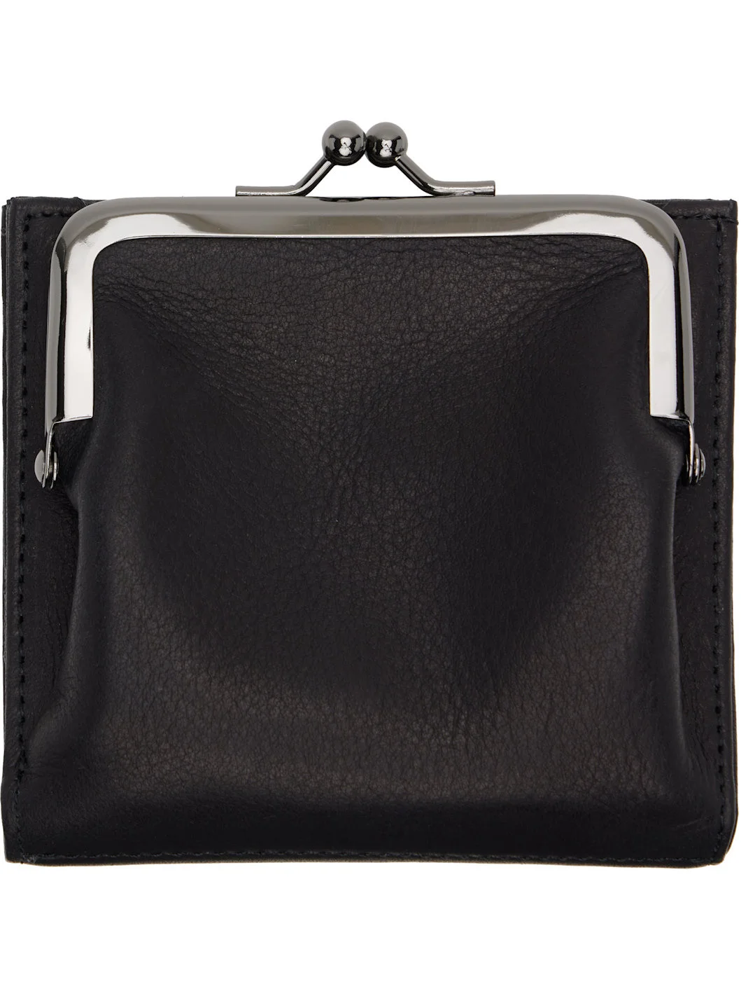 Grained leather bifold wallet. · Kiss-lock coin pouch at face · Eight card slots at interior · One note slot · Gunmetal-tone hardware · H4" x W3.5" x D0.5" Part of the discord YOHJI YAMAMOTO collection. Supplier color: Black Leather. Made in Japan 252573F040005