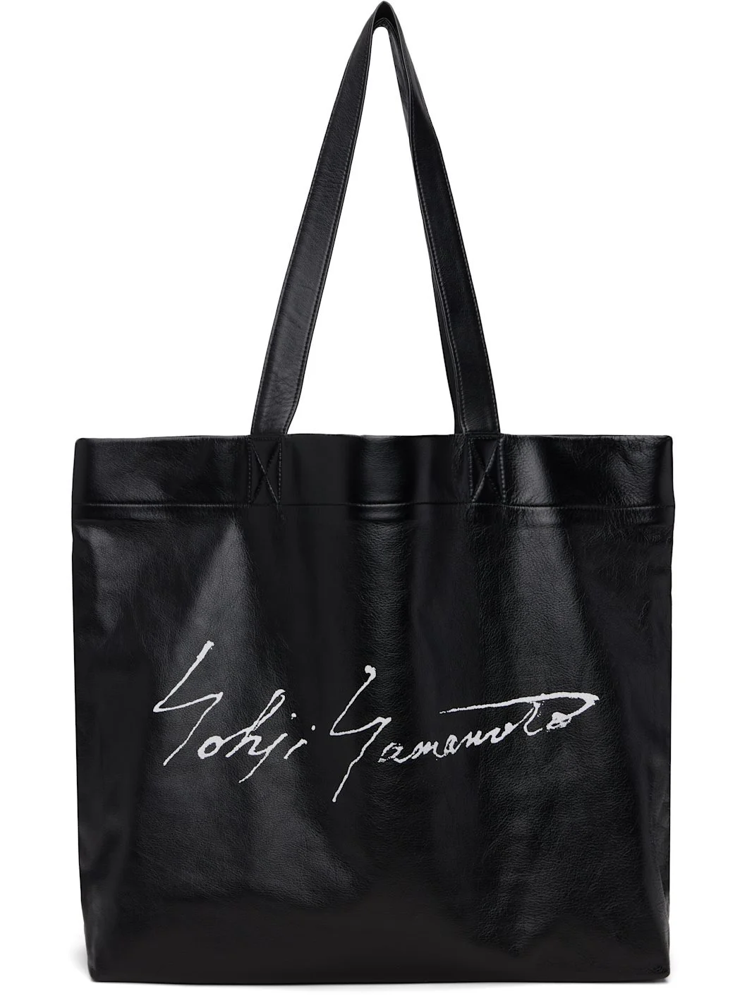 Grained leather tote. · Fixed shoulder straps · Logo printed at face · Patch pocket at interior · Twill lining · H14" x W19" x D5" Part of the discord YOHJI YAMAMOTO collection. Supplier color: Black Leather. Made in Japan 252573F049002