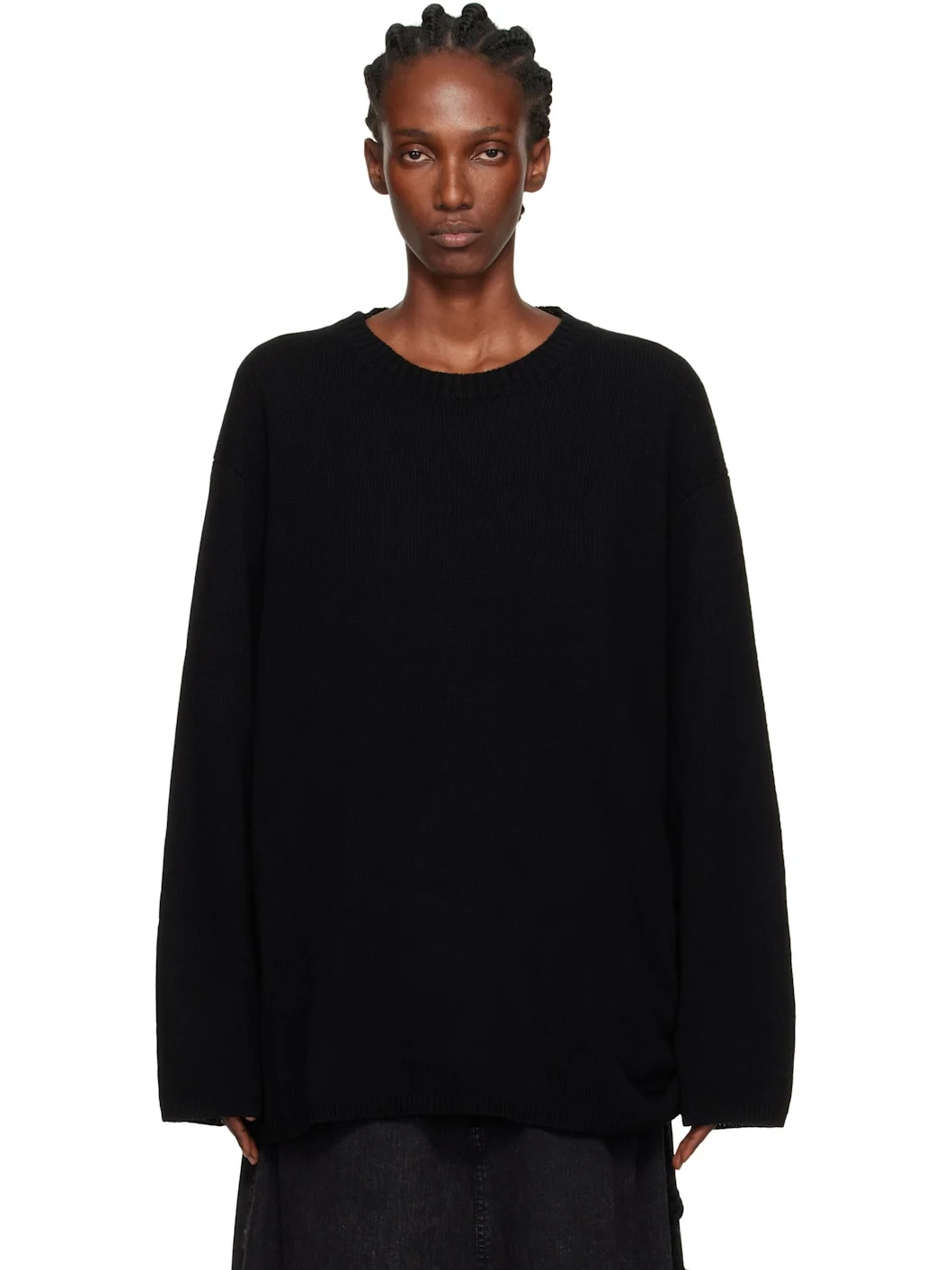 Knit wool sweater. · Rib-knit crewneck, hem, and cuffs · Braided extended trim at hem side seam · Dropped shoulders Part of the Yohji Yamamoto POUR HOMME collection. Supplier color: Black 100% wool. Made in Japan 252573F096001