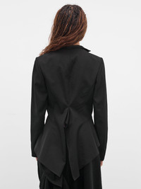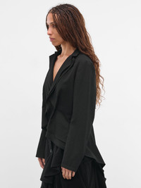 A black wool gabardine jacket crafted from Yamamoto's signature wrinkled fabric. Its slightly fitted waist and layered lapel create an architectural drape. Featuring: • Tailored fit • Wrinkled wool gabardine construction • Layered notched lapel • Structured shoulders and long sleeves • Gathering and pleating at front and back • Curved layered hems • Made in Japan • 100% Wool • Japanese sizing Model is 5'8" wearing size 2. Bust: 33” Waist: 25.5” Hips: 34”