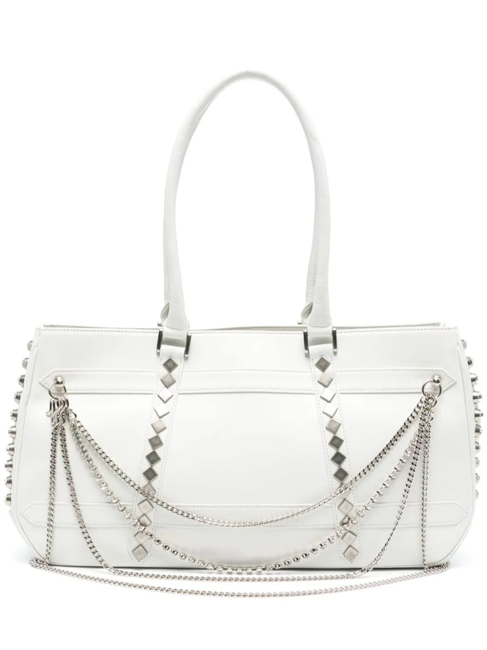 chain-detail leather shoulder bag Highlights - Optical white - Nappa leather - Chain-link detailing - Crystal embellishment - Two top handles - Main compartment - Internal zip-fastening pocket - Multiple internal slip pockets - Internal logo patch - Full lining - Metal feet - Silver-tone hardware - Clasp fastening Imported Composition Nappa Leather 100% SIZE & FIT Model measurements Height 5 ft 10 in(1.77 m) Bust/Chest 33.07 in(84 cm) Hips 37 in(94 cm) Waist 24.8 in(63 cm) Measurement DEPTH 3.93 in(10 cm) HANDLE 9.44 in(24 cm) HEIGHT 8.46 in(21.5 cm) WIDTH 16.92 in(43 cm)