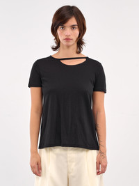 YOHJI YAMAMOTO t-shirt in black, paneled construction, crewneck, neck cut-out, back cut-outs & adjustable cinch straps, short sleeves, straight hem, relaxed fit. Japanese Sizing Model is 5'7" wearing size 2. Bust: 34" Waist: 26" Hips: 34"