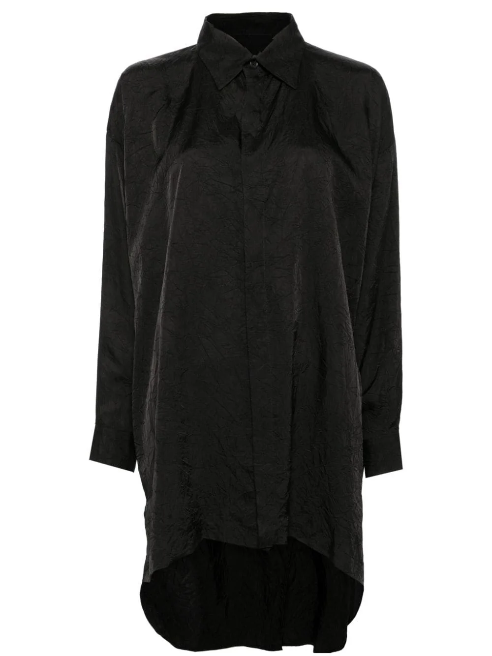 creased button-down shirt Highlights - Black - Crease effect - Concealed front fastening - Classic collar - Long sleeves - Flared hem - High-low hem Imported Composition Cupro 100% SIZE & FIT Model measurements Height 5 ft 10 in(1.77 m) Bust/Chest 31.49 in(80 cm) Hips 35.43 in(90 cm) Waist 25.19 in(64 cm) FittingInformation Designed to be unstructured, offering a loose fit throughout Made from a lightweight non-stretch fabric This piece fits true to size – take your usual size