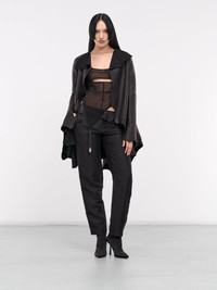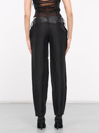 YOHJI YAMAMOTO trousers in black, paneled gabardine construction, low-waisted, asymmetric leather detailing, belt loops, front concealed zip fly closure, side pockets, tapered leg, relaxed fit. Made in Japan Japanese Sizing Model is 5'8" wearing size 2. Bust: 32" Waist: 26" Hips: 34.5"
