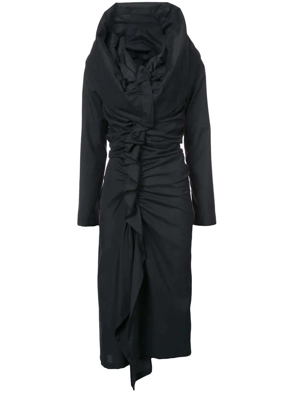 gathered dress Black cotton blend gathered dress from Yohji Yamamoto. Imported Composition Outer: Polyester 65%, Rayon 35% Lining: Polyester 65%, Cotton 35% SIZE & FIT Model measurements Height 5 ft 10 in(1.79 m) Bust/Chest 31.1 in(79 cm) Hips 33.85 in(86 cm) Waist 22.83 in(58 cm) Washing instructions Dry Clean Only