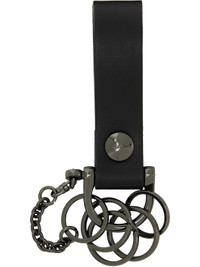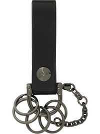 Keychain in gunmetal tone. · D-ring with screw-on fastening · Key rings at drop · Buffed leather lanyard · H4.5" x W1.5" Part of the discord YOHJI YAMAMOTO collection. Supplier color: Black Metal, leather. Made in Japan 252573F025003