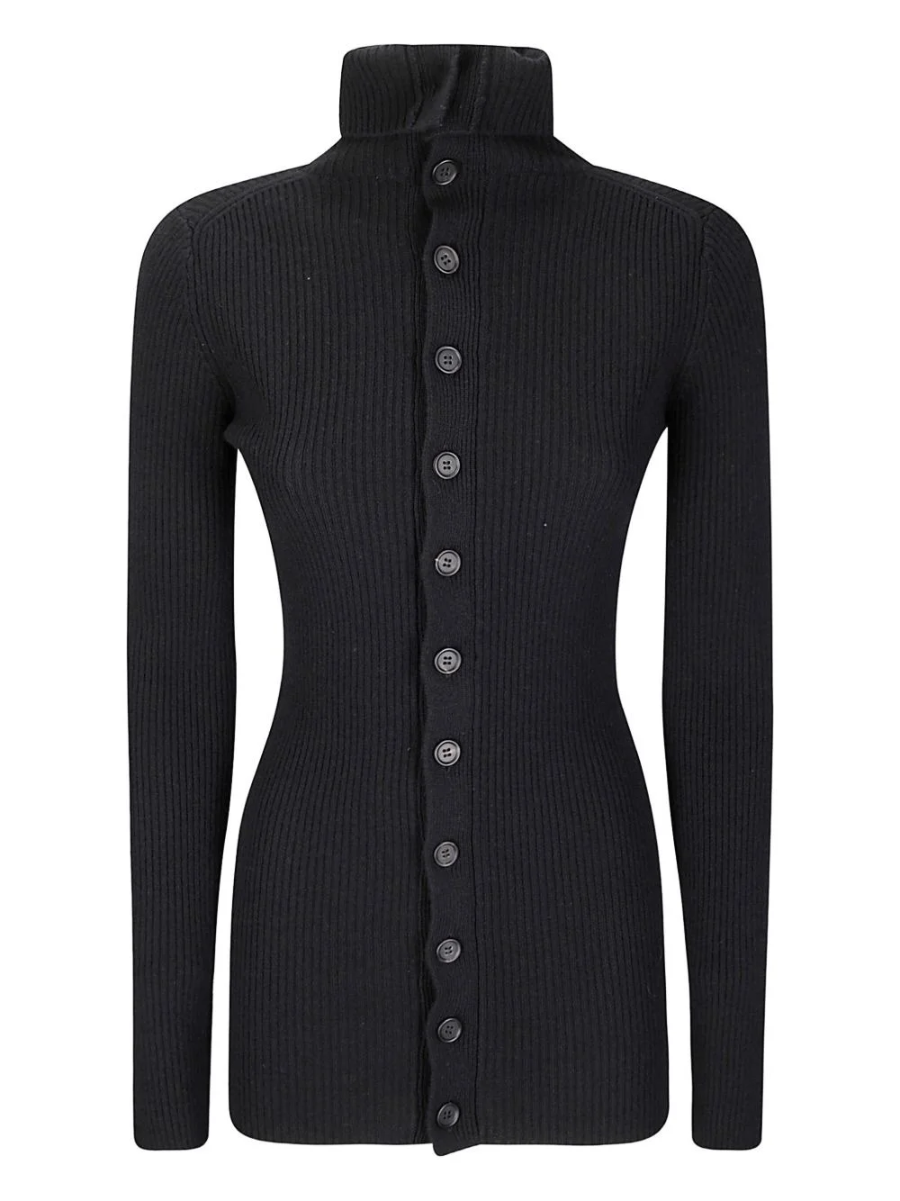 high-neck ribbed buttoned cardigan Highlights - Black - Ribbed knit - High neck - Button fastening - Long sleeves - Straight hem Imported Composition Wool 90%, Cashmere 10% Washing instructions Read Manufacturer Guidelines