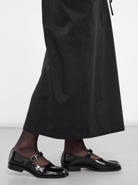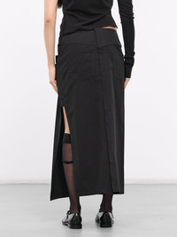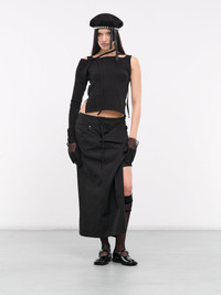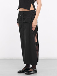 YOHJI YAMAMOTO skirt in black, paneled twill construction, low-rise, front lace-up fastening, draped paneling, inset pocket & rivets, back patch pockets, deep side slit, straight hem, maxi-length, slim fit. Made in Japan Japanese Sizing Model is 5'8" wearing size 1. Bust: 32" Waist: 26" Hips: 34.5"