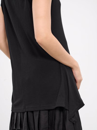 YOHJI YAMAMOTO top in black, paneled cotton construction, asymmetric rounded neck, short sleeves, draping, asymmetric hem, relaxed fit. Made in Japan 100% Cotton Japanese Sizing Model is 5'8" wearing size 2. Bust: 32" Waist: 26" Hips: 34.5"
