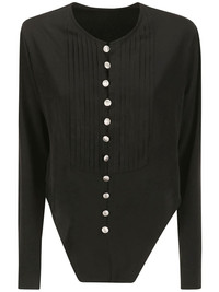 pleated asymmetric-hem blouse Highlights - Black - Pleat detailing - Round neck - Front button fastening - Long sleeves - Asymmetric hem Imported Composition Triacetate 57%, Polyester 43%