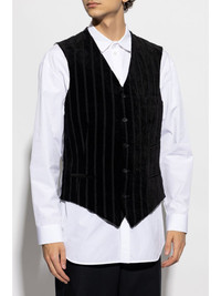 striped waistcoat Highlights - Black - Cotton - Vertical stripe pattern - Front button fastening - V-neck - Sleeveless - Three front welt pockets - Adjustable strap to the rear - Straight hem Imported Composition Polyester 100%, Cotton 100% SIZE & FIT FittingInformation Designed to be unstructured, offering a loose fit throughout The adjustable tabs allow for fitted preferences Made from a midweight non-stretch fabric