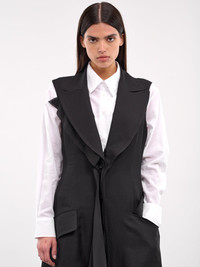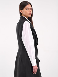 YOHJI YAMAMOTO dress in black, wool-silk blend, paneled construction, notched lapel, v-neckline, sleeveless, armscyes, layered button placket closure, bodice darting, side flap pockets, back vent, layered hems, maxi-length, relaxed fit. Made in Japan Main: 75% Wool 25% Silk Parts: 80% Wool 20% Silk Japanese Sizing Model is 5'8" wearing size 3. Bust: 32.5" Waist: 24" Hips: 34"