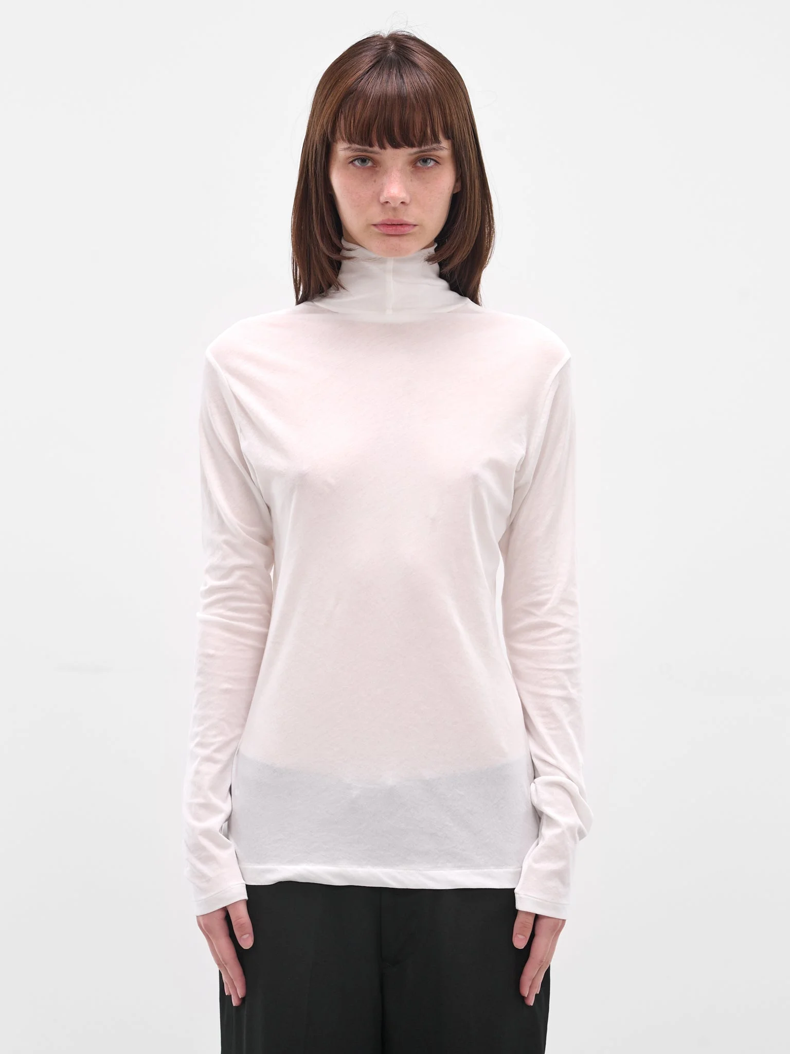 A white turtleneck top in high-twist cotton jersey with a crisp, lightweight texture. The soft drape, stretch, and subtle sheen make it ideal as a versatile layering piece. Featuring: • Slim fit • High-twist jersey construction • Turtleneck • Long sleeves • Designed for layering • Made in Japan • 100% Cotton • Japanese sizing Model is 5'7" wearing size 2. Bust: 30" Waist: 22" Hips: 33"