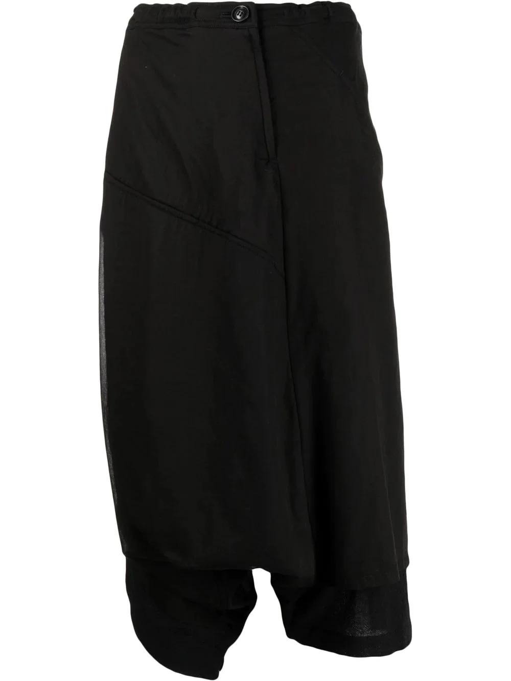 asymmetric cropped trousers black cotton asymmetric hem front button fastening elasticated waistband layered design Imported Composition Cotton 100% SIZE & FIT Model measurements Height 5 ft 11 in(1.8 m) Bust/Chest 28.34 in(72 cm) Hips 35.43 in(90 cm) Waist 23.62 in(60 cm) FittingInformation This piece fits true to size. We recommend you get your regular size Designed to be fitted at the waist, loose over the leg Made with a mid-weight fabric Washing instructions Dry Clean Only