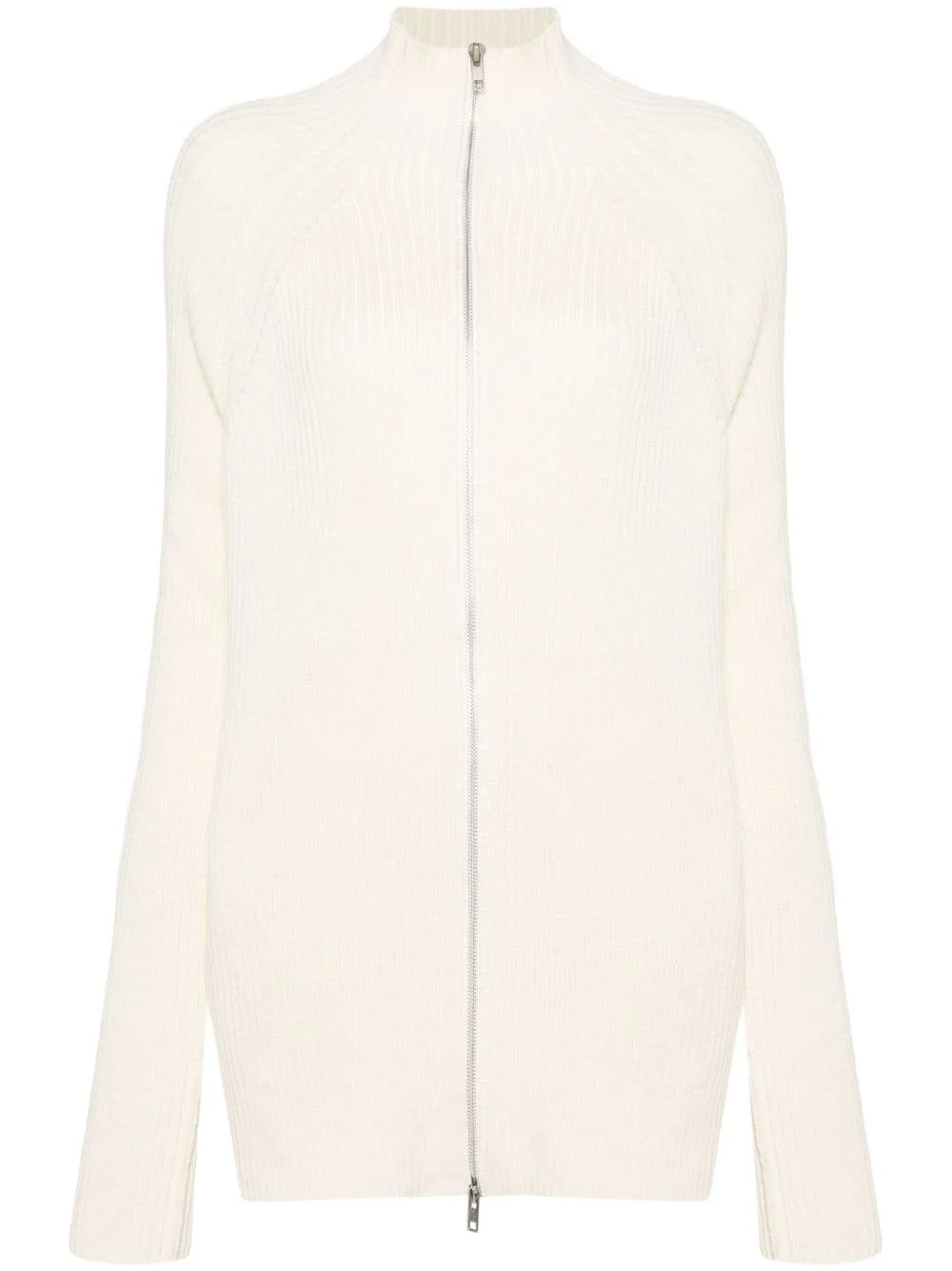 zip-up ribbed-knit cardigan Highlights - Off-white - Wool-cotton blend - Ribbed knit - High neck - Front two-way zip fastening - Long raglan sleeves - Two side inset pockets - Straight hem Imported Composition Wool 50%, Cotton 50% SIZE & FIT Model measurements Height 5 ft 11 in(1.8 m) Bust/Chest 32.67 in(83 cm) Hips 36.22 in(92 cm) Waist 25.19 in(64 cm) FittingInformation Designed for a relaxed fit, this piece allows for comfort and movement when worn Made with a midweight knit, this piece offers some stretch This piece fits true to size – take your usual size