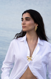 St Barth meets Greece in an exclusive collaboration hand-sculpted by YSSO for Eden Rock - St Barths. The frangipani flower, soft-edged and fragrant, it informs the gentle structure of this design drawing on the quiet elegance of island mornings, sculpted to echo nature's own balance of delicacy and strength. Each necklace is hand-sculpted in Greece. Details Made in Greece, from up to 35% recyclable bronze double plated with 18 and 24 karat gold. Artfully hand-sculpted, fully adjustable. The length of the cord in the picture is indicative. Weighs 31 grams.