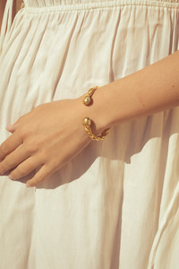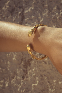 THE DESIGN STORY Part of our exclusive capsule collection with One&Only Kea Island, the Kea bracelet takes inspiration from the island’s populous oak trees and the Mediterranean sea. Finished at both ends with acorn caps, the adjustable, unisex cuff has a braided, nautical design that nods to the abundance of sailboats surrounding Kea. Details Made in Greece, from up to 35% recyclable bronze double plated with 18 and 24 karat gold. Artfully hand-sculpted, fully adjustable. Unisex. H: 0.8cm, D: 6.6cm Weighs 42 grams.
