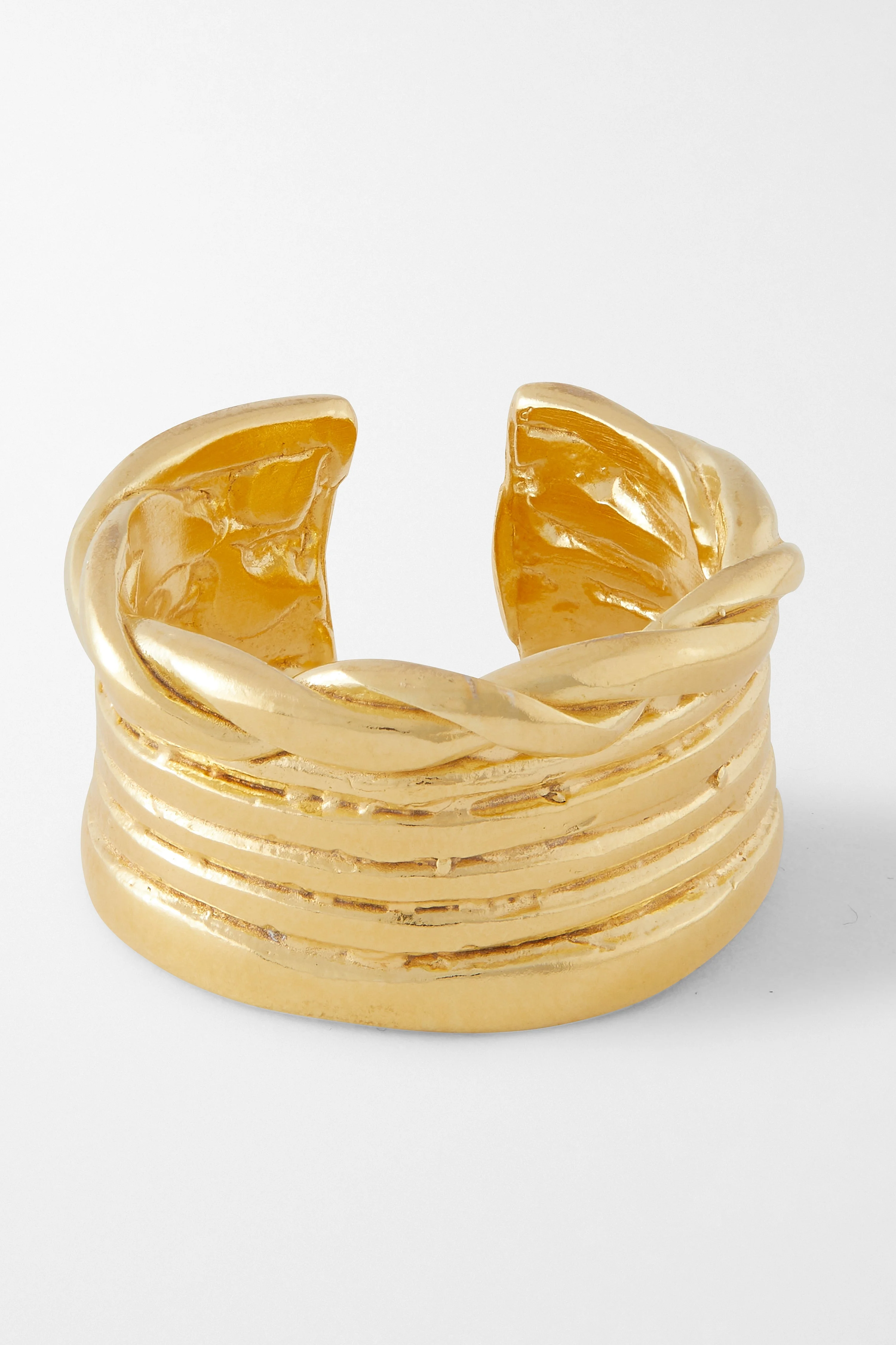 THE DESIGN STORY Giving the appearance of multiple stacked rings, our Stemma ring is beautifully carved in single and braided layers. Stemma, or family tree, references the “tight-knit” design of this ring. Classic and elegant, it is a timeless addition to any jewellery collection. Details Made in Greece, from up to 35% recyclable bronze double plated with 18 and 24 karat gold. Artfully hand-sculpted, semi-adjustable. Weighs 7 grams.