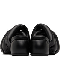 Padded buffed faux-leather slip-on heeled sandals in black. · Open square toe · Crisscrossing straps at vamp · Logo-embossed padded footbed · Covered block heel · Treaded rubber sole · Heel: H2.5" Supplier color: Black Upper: synthetic. Sole: rubber. Made in Portugal 251844F125003