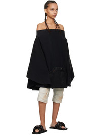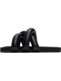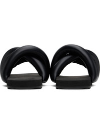 Padded buffed leather slip-on sandals in black. · Open square toe · Crisscrossing straps at vamp · Logo embossed at leather footbed · Treaded rubber sole Supplier color: Black Upper: leather. Sole: rubber. Made in Portugal 251844F124002