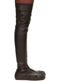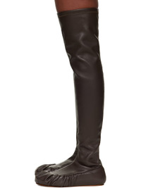 Thigh-high stretch faux-leather boots. · Paneled construction · Gathering at toe and sides · Bonded jersey lining · Leather sole Supplier color: Chocolate Upper: synthetic. Sole: leather. Made in Portugal 252844F116000