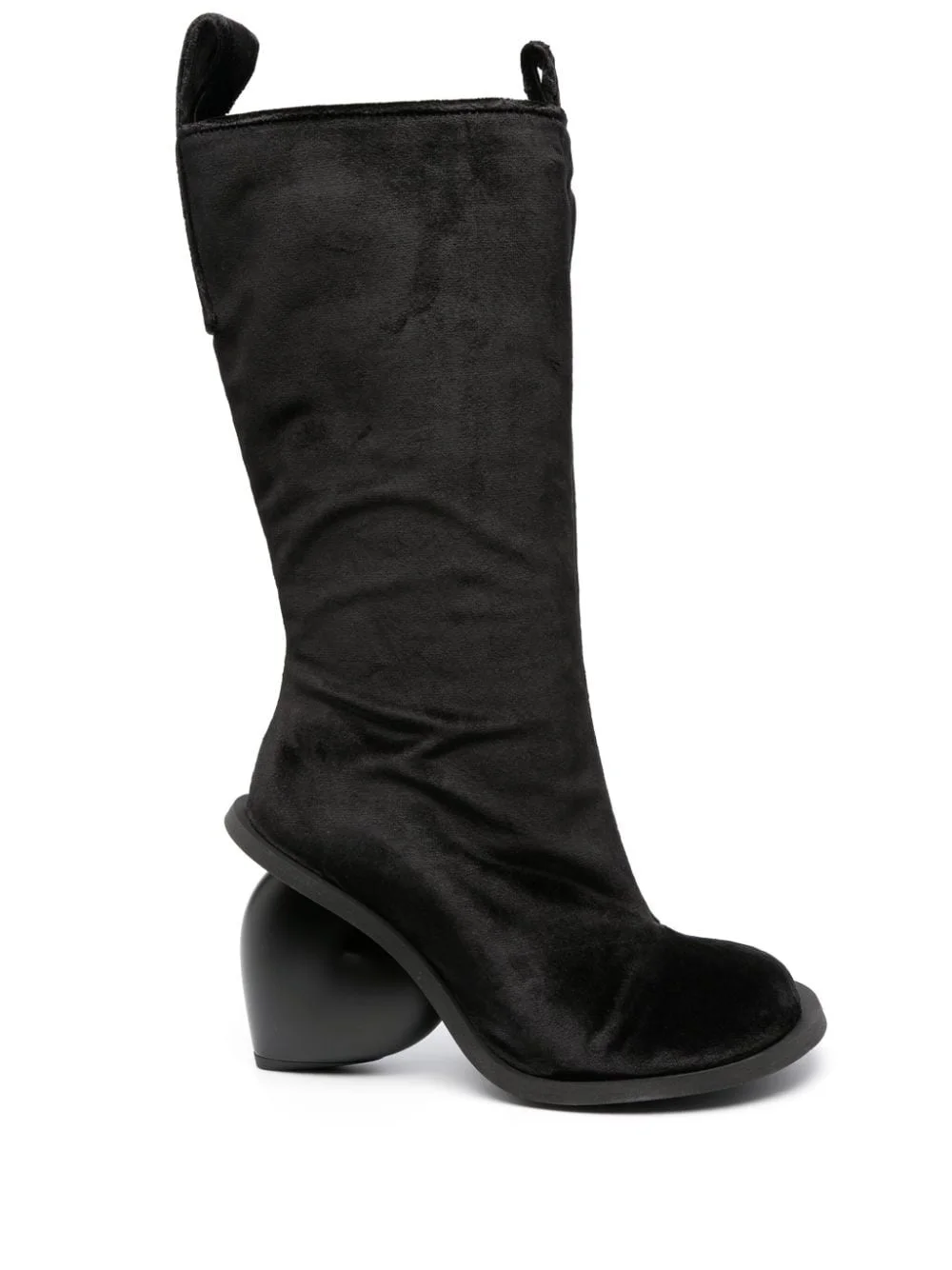 Love 115mm velvet mid-calf boots Highlights - Black - Velvet - Round toe - Double pull-tab at the opening - Side zip fastening - Mid-calf length - Heart-shaped heel Imported Composition Outer: Fabric 100% Lining: Rubber 100% Sole: Rubber 100% SIZE & FIT Measurement CIRCUMFERENCE 12.59 in(32 cm) HEEL 4.52 in(11.5 cm) HEIGHT 10.23 in(26 cm) Sole height 0.59 in(1.5 cm)