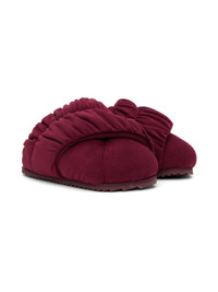 Quilted faux-suede loafers in red. Gathering throughout. · Square toe · Faux-leather lining · Logo printed at platform midsole · Treaded rubber outsole · Platform: H1.5 in Available exclusively at SSENSE. Supplier color: Burgundy Upper: synthetic. Sole: rubber. Made in Portugal 222844F121012