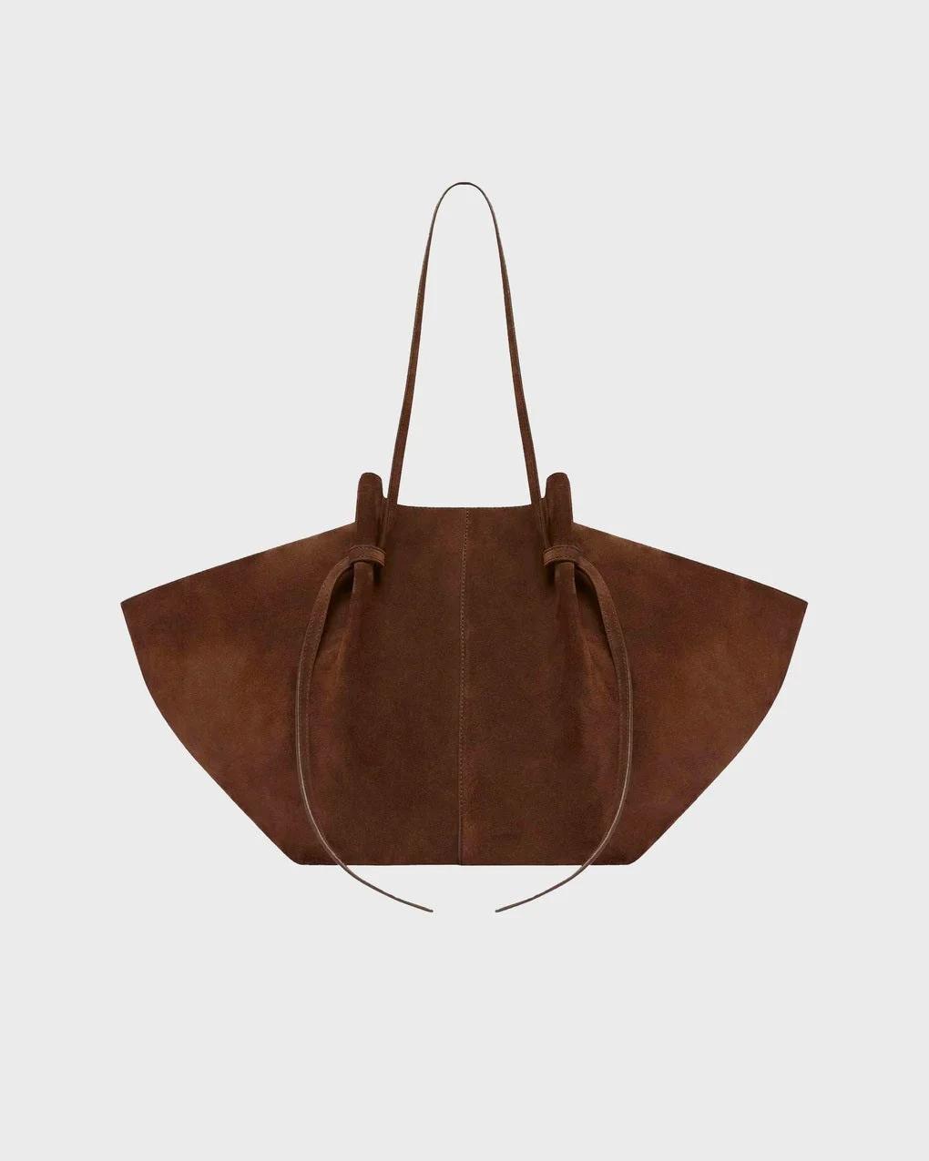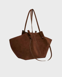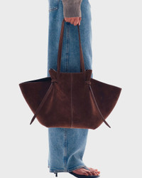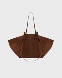 Due to high demand, your order may take a few extra days to ship. Large Mochi Suede Bag by Yuzefi. The Large Mochi is an elegant everyday bag featuring organic curves, soft folds, and their signature knot. Handcrafted from luxurious, sustainable LWG-certified Italian suede. It fits everything you need. Comfortable to wear over the shoulder with a magnetic closure. Adjustable straps with a signature knot for the desired length. Size and Fit - 51cm x 26 - 5cm x 31cm Specification - Article number - ID: 176620-950 - Brand: YUZEFI - Color: Chocolate