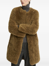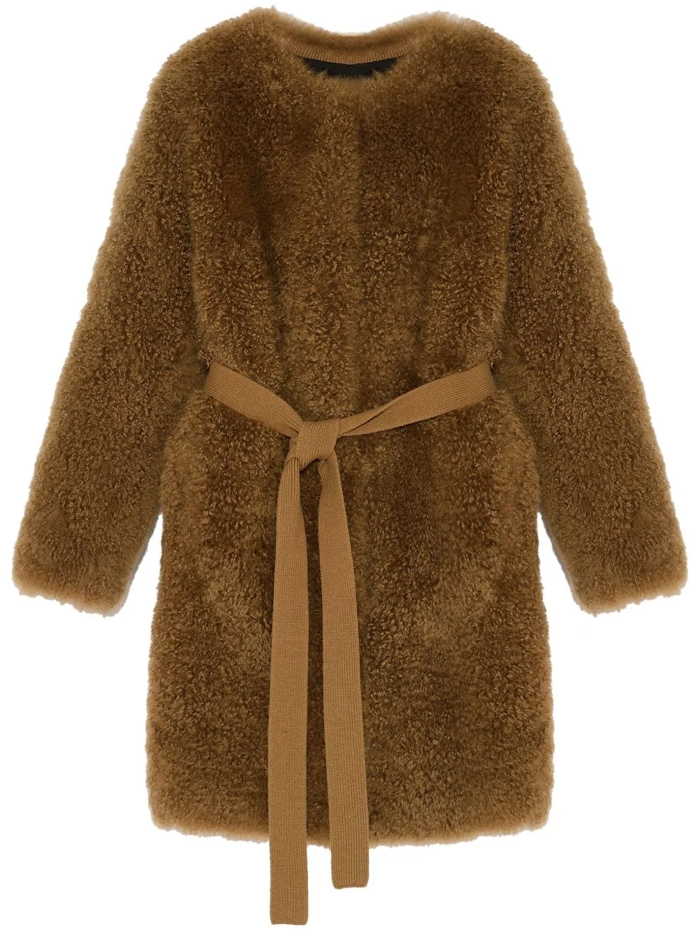belted coat Highlights - Golden brown - Sheepskin - Shearling - Belted waist - Crew neck - Long sleeves - Two side slit pockets - Full lining - Straight hem Made in France Composition Sheep Skin/Shearling 100%, Silk 100% Washing instructions Read Manufacturer Guidelines