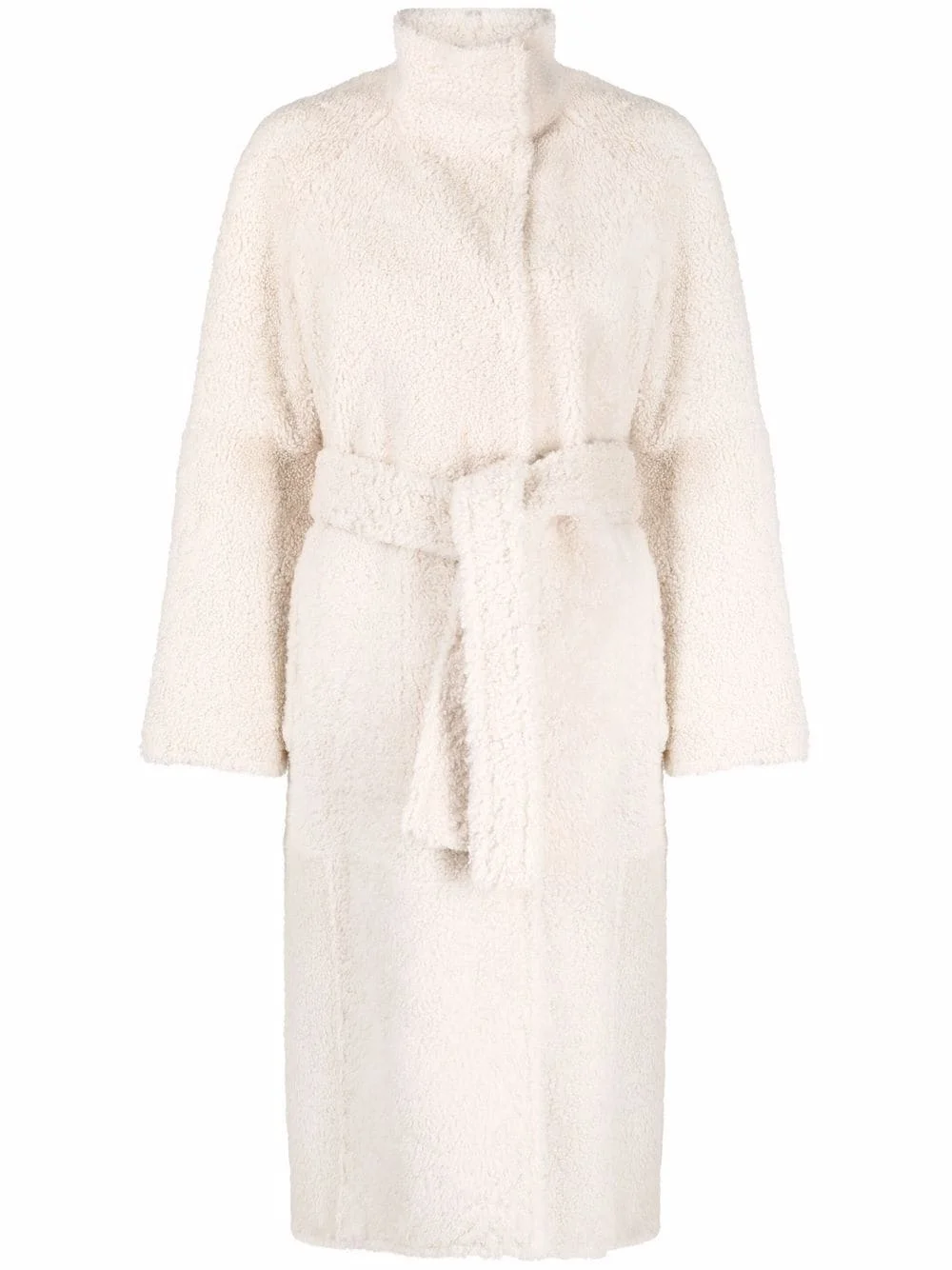 belted shearling coat meringue whit lamb fur/lambskin shearling trim high neck concealed front fastening belted waist slip pockets to the sides long sleeves leather lining knee-length Imported Composition Lining: Lamb Skin 100% Outer: Lamb Fur 100% Washing instructions Specialist Cleaning
