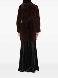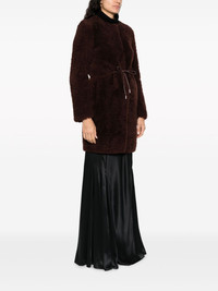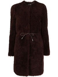 belted shearling coat Highlights - Bordeaux red - Shearling - Round neck - Concealed front fastening - Belted waist - Long sleeves - Two side inset pockets - Thigh-length Made in France Composition Lining: Lambskin 100% Outer: Lamb Fur 100% SIZE & FIT Model measurements Height 5 ft 10 in(1.79 m) Bust/Chest 33.07 in(84 cm) Hips 35.82 in(91 cm) Waist 24.01 in(61 cm) Measurement CHEST 39.37 in(100 cm) SLEEVE LENGTH 25.59 in(65 cm) LENGTH 36.61 in(93 cm) FittingInformation Designed for a slim fit that sits just away from the body offering a close yet comfortable fit The tie fastening gives an adaptable and personalised fit Firm shearling has a treated construction offering some durability This piece fits true to size – take your usual size Washing instructions Specialist Cleaning