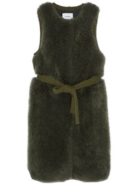 belted shearling gilet Highlights - Olive green - Shearling - Belted waist - Front hook and eye fastening - Ribbed trim - Crew neck - Sleeveless - Long length Made in France Composition Wool 100% Washing instructions Read Manufacturer Guidelines