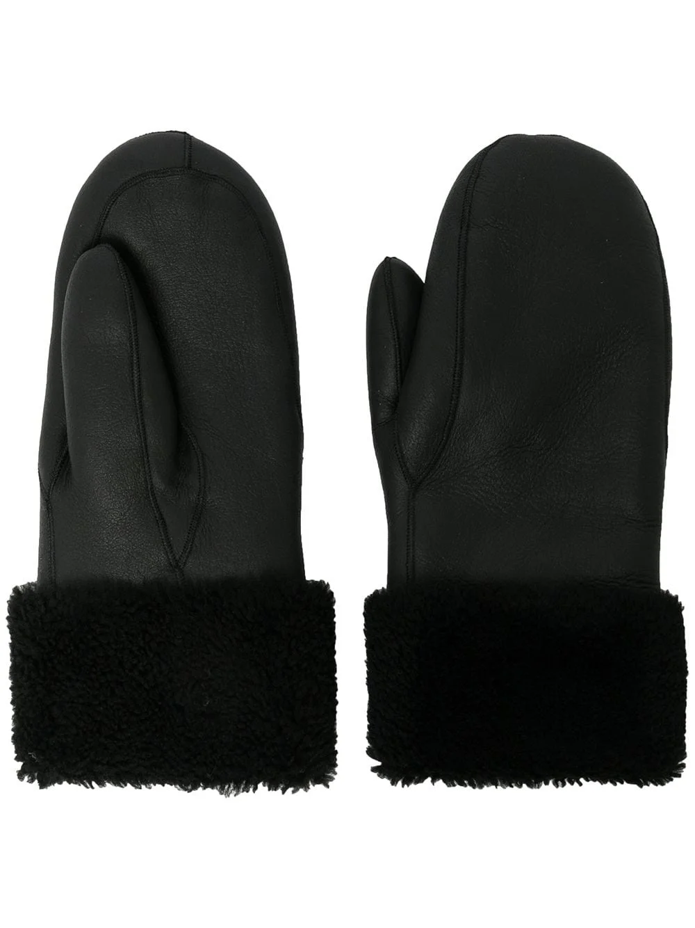 short lambskin mittens jet black lambskin logo patch to the side slip-on style shearling trim Made in France Composition Body: Lamb Skin 100% SIZE & FIT Measurement TOTAL LENGTH 10.03 in(25.5 cm)